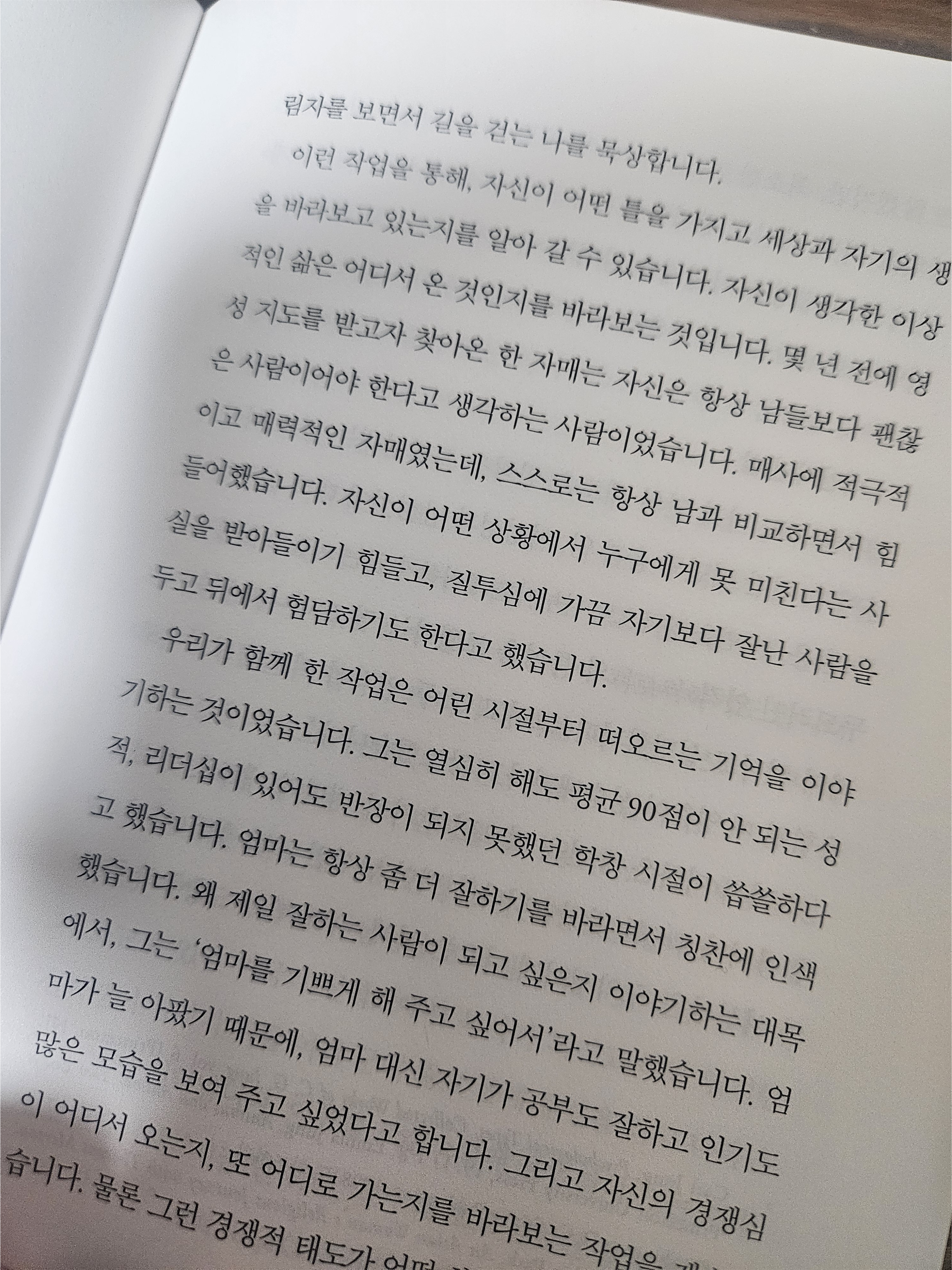 215쪽 '열심히 살아온 것 같은데 이것이 과연 나의 삶인가'하는 의문이 들기 시작할 때, 우리는 생의 가을이 시작되었음을 알게 됩니다. 한편으로는 부모님을 비롯한 주변의 어른들이 쇠약해지고 돌아가시는 모습을 봅니다...걸어온 길에 새겨진 발자국에서 스스로 새로운 의미를 찾아내는 일에서 시작됩니다.