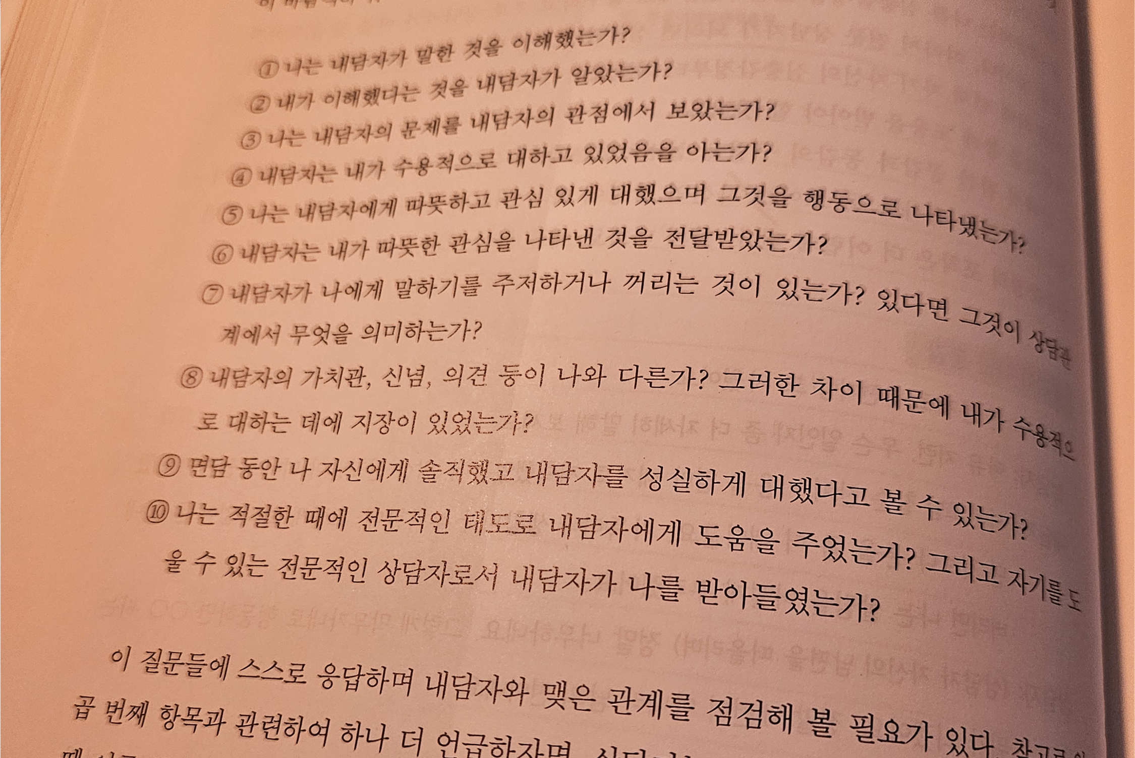 앞의 모든 것들은 라포 형성을 위한 밑 작업.온화하고 수용적인 분위기를 만드는 것.부드럽고 따스한 관심과 태도, 전문가로서 전문성과 여유로움도 전달할 수 있으면 좋다.심리상담이 자문식 상담이나 일상 대화와 다른 특징 중 하나는 항상 감정에 주목한다는 것.